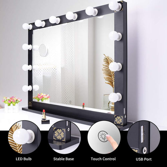 Hollywood Lighted Vanity Mirror, Tabletop Makeup Mirror with 12 Dimmer LED Bulbs, Large Dressing Cosmetic Mirror(Black)